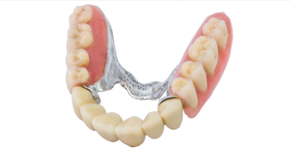 - Descriere: Este o proteză parțială, sprijinită pe o structură metalică ușoară (din aliaje biocompatibile), care folosește croșete sau alte sisteme pentru a se ancora pe dinții naturali rămași.